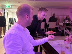 The buffet was delicious, but the real surprise came in the form of an illusionist. He visited every table, amazing everyone with his tricks. One moment you were simply eating, and the next he pulled a shoe out of your ear. It led to hilarious moments. At the end of the evening, he gave a final show that everyone enjoyed.