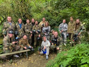 Group 1 took up position on one side of the field, while group 2 lined up on the other. The tension was palpable. Paintballs flew past us and every hit was clearly audible. One of the highlights was undoubtedly our own Wout, who stormed onto the field dressed as a rabbit and with only one paintball left in his gun, like some kind of Rambo. He ran around screaming, only to be thoroughly hit by both the opposing team and his own teammates. It was a spectacle not soon to be forgotten!
