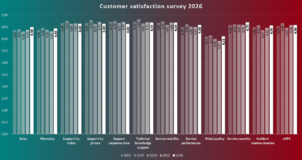 Het klanttevredenheidsonderzoek van 2026 laat een consistent hoog tevredenheidsniveau zien, met scores tussen de 4,4 en 4,7 op een schaal van 5. De hoogst scorende categorieën hebben betrekking op de veiligheid en stabiliteit van onze dienstverlening. Ook onze technische kennis en ondersteuning worden door onze klanten zeer gewaardeerd. Als Managed Hosting-specialist zijn dit de gebieden waarop wij kunnen uitblinken en dat doen we ook!
