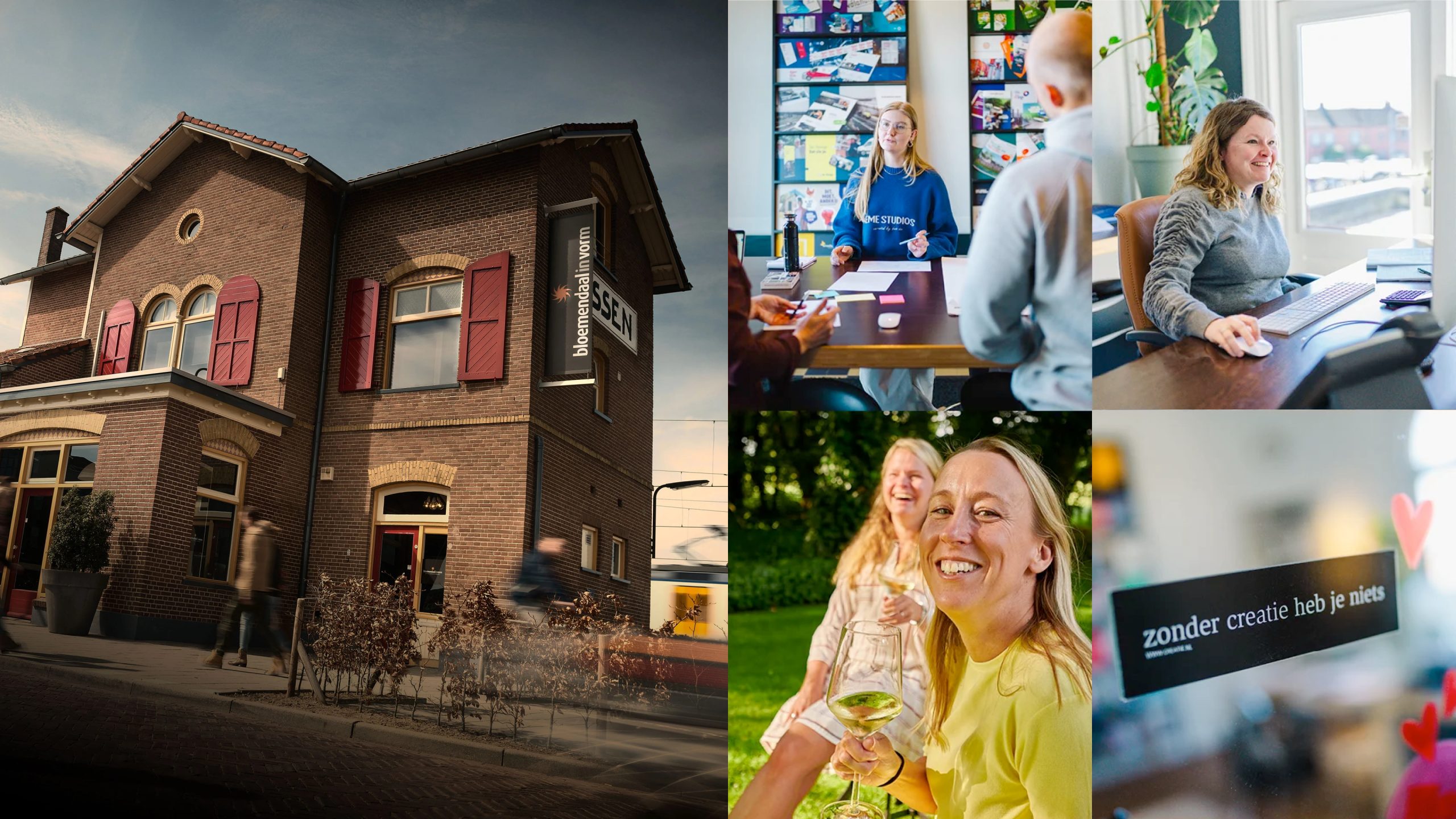 Sinds 1995. Een hecht team van momenteel 12 collega’s (en zo heel af en toe leuke vacatures). Gevestigd in het stationsgebouw uit 1886 in Rijssen. Serieus aan het werk, ideeën uitwisselen en lol maken: het gaat om goed samenwerken, plezier hebben en natuurlijk om mooie dingen maken! Dat doen we samen; Bloemendaal in Vorm en Filmvalue. Allemaal onder één dak.